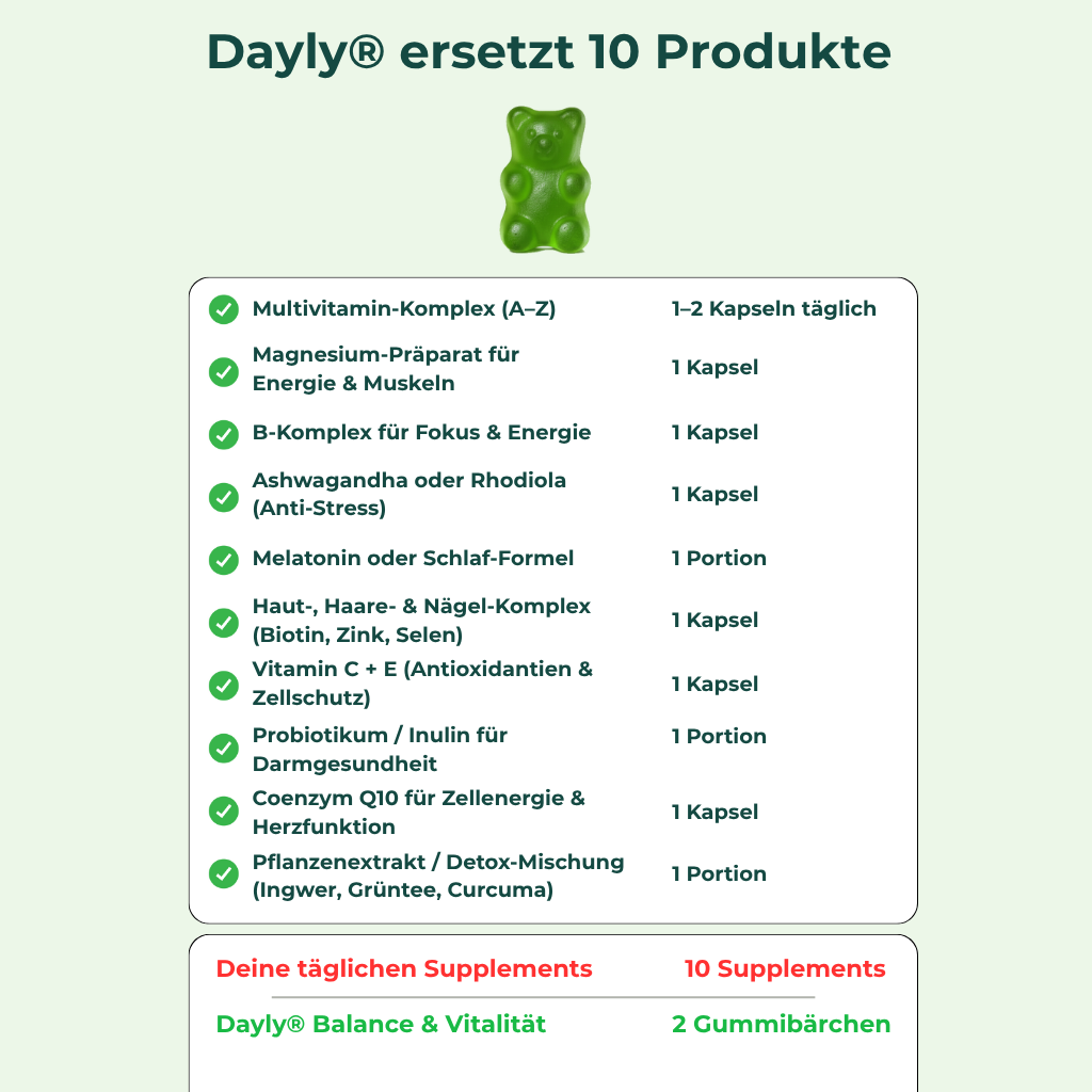 Deine tägliche Routine: 2 leckere Dayly® Gummibärchen = die Wirkung von 10 hochwertigen Supplements!