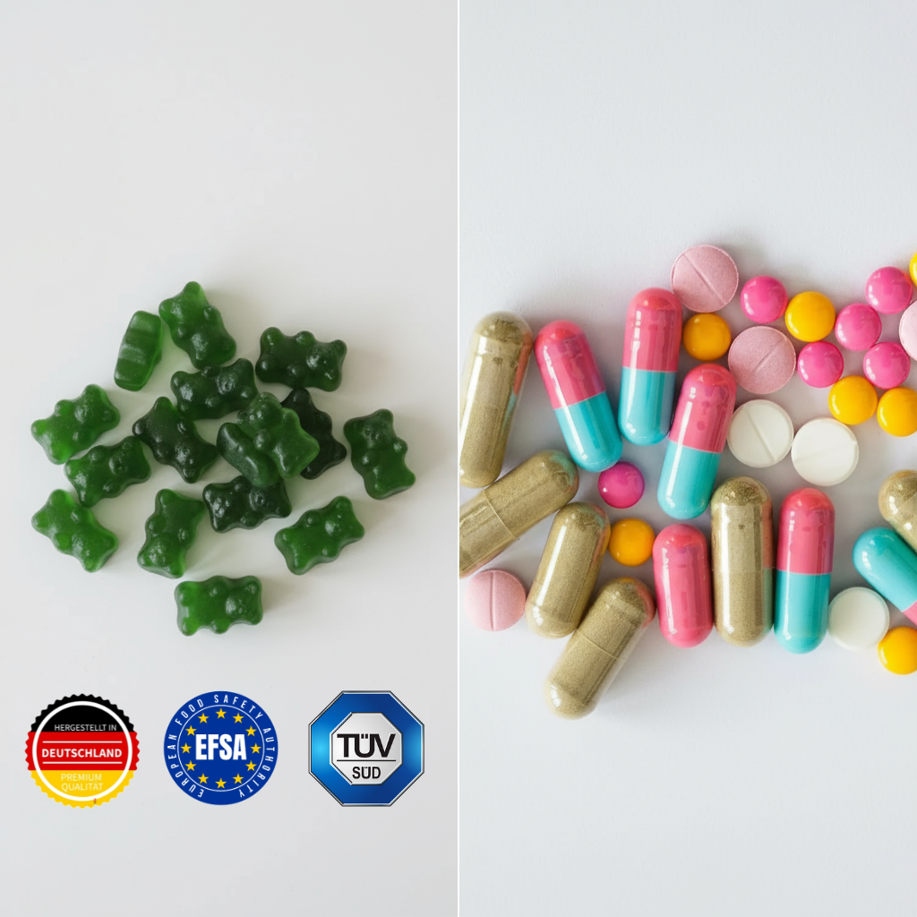 Jedes Gummibärchen liefert präzise dosierte, bioaktive Wirkstoffe in veganer, zuckerfreier Form. Entwickelt in Deutschland für maximale Aufnahme und Wirkung.